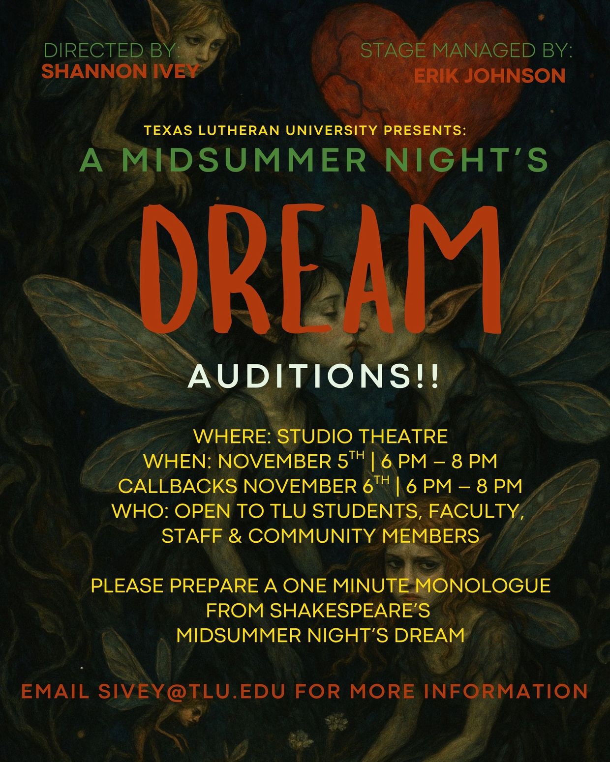 Auditions will take place next Wednesday and Thursday (11/5-11/6) from 6:00–8:00 PM in the TLU Studio Theatre.